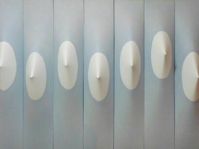 Sánchez’s early work in Cuba developed an approach to formal abstraction through the production of paintings and drawings, alongside the design of furniture and theater sets. Influenced by the Havana based modernist painter Victor Manuel, she became associated with a group of artists and intellectuals known as Sociedad Cultural Nuestro Tiempo. Her scenographic work with a “guerilla” theater group called Los Yesistas (The Plasterers) signaled her involvement with a pre-revolutionary, anti-Batista workers movement. As a result of regular exhibitions in Havana she received work and travel grants enabling her to travel to Europe, before moving to New York in 1964. Living in the city for eight years and studying at Pratt Institute, she began working with elaborated stretcher frames in order to produce shaped canvases, painted in neutral tones and emphasizing a sculptural abstraction of bodily form. Alongside ink drawings of multiplying cellular constellations, her paintings have often taken on a modular character, comprised of two or more abutting parts. This seriality has become a cornerstone of Sánchez’s practice: she continues to rework and add to paintings begun in the 1970s, considering each work to be a part of a larger whole. Alongside the sensual and haptic “queering” of a hard-edged, minimalism, her multi-part works bear relation to the temporal and semiotic sequencing of musical notation.