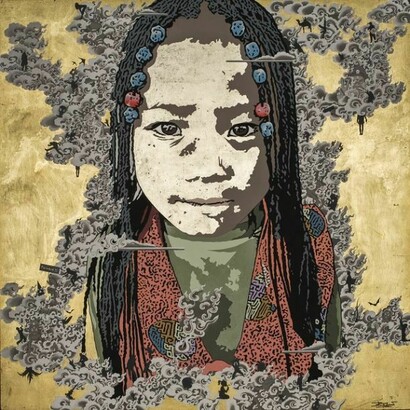 "Golden Child/Black Clouds, is a continuation of my previous paintings using both the Tibetan Spirit iconography from my solo show last year as well as silhouettes. The spirits initially acted as pioneers exploring the new and foreign environments in which the Tibetan Diaspora found themselves living after 1959. Now, the spirits are wiser, looking over a new generation of Tibetan children. The use of children in this series brings immediacy and a more personal connection to today’s events. The spirits still lurk in the surrounding black smoke clouds, bearing witness to all that is unfolding and transforming.