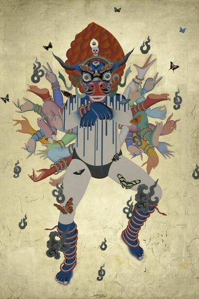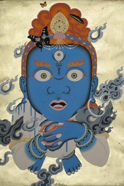 His technique is precise and as immaculate as ever, but the new Tibeto/Californian spirits are possessed of a revitalised energy: some depicted as children, others shown as quaintly demonic or possessed of a cocksure sexiness. Often he appropriates globalised icons and logos of mass culture and luxury branding, taken from the internet, in a style he calls CyberPop.