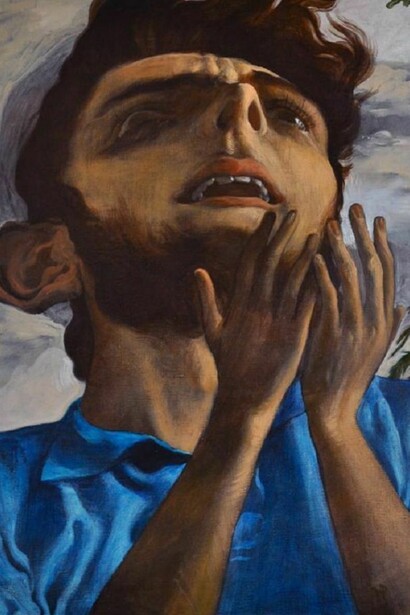 Similarly, poverty oscillates between caricature and reverence in The Happy Servant, while The Happy Sweeper brushes away in a sentimental Disneyland of daisies and four-leaf clovers. In both works, one senses the inherent isolation of the central figure in an otherwise carelessly jubilant gathering or classically-inspired milieu. Further emphasizing this skewed reality in both works are the subjects’ frozen smiles, which exude a foreboding quality slithering under a skin of frivolity.