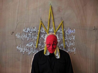 By contrast, in the series Text Image (Azazeel – Satan -2010), the artist assumes the role of the devil. Samra dons a series of brightly coloured and disconcerting masks to become this demonic character, staring out of the frame beneath the numbers ‘666’ scrawled across the background. The artist’s juxtaposition of these two powerful and symbolically loaded characters asks the question: “does the mass media hypnotize and control us through a disguised and distorted visual language of hypnotic characters, of angels and devils, which we have all come to accept as truth?”