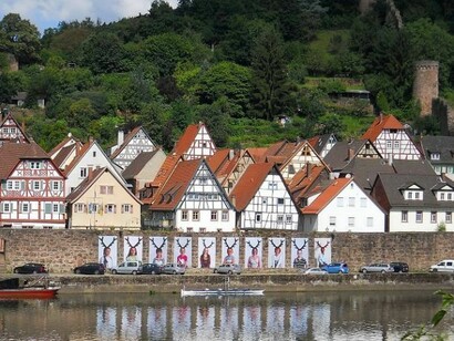 A Neckargemund, dopo 10 km dalla partenza, passo sul lato destro del mio percorso. Poi sotto il piccolo paesino di Dilsberg, arroccato su uno spuntone di roccia. Pochi chilometri e sono a Hirschhorn a percorrere la parte interna di un'ansa strettissima del fiume. Questa è la regione del Hessen, la più grande regione viticola della Germania. Sparse nella campagna alcune grandi costruzioni simili a delle piramidi di 3 o 4 metri di altezza mi incuriosiscono. Un cartello all’accesso di una scala in ferro che porta alla sommità reca scritto in tedesco “Protettorato Acquatico”. La mancanza del contachilometri non mi fa stare bene! Ho necessità di sapere quanti chilometri ho percorso, per poi pianificare le tappe successive del viaggio, quindi devo necessariamente tentare di ripararlo o, in alternativa, alla prima città comprarne un altro. In un piccolo giardino all’uscita di un single track, mi fermo in un chiosco per una pausa con torta e caffè e ne approfitto anche per tentare, con successo, di ripararlo. In breve eccomi a Eberbach tra le colline del Odenwald. La città sorge sull’altro lato del Neckar. Qui a Eberbach un'abbazia fu set cinematografico per alcune riprese del film Il nome della rosa. Poco dopo passo per Rockenau e vicino a Bad Wimpfen, che è definita una città delle fiabe, con i vecchi edifici straordinariamente conservati. Ma decido di non compiere questa deviazione.