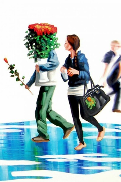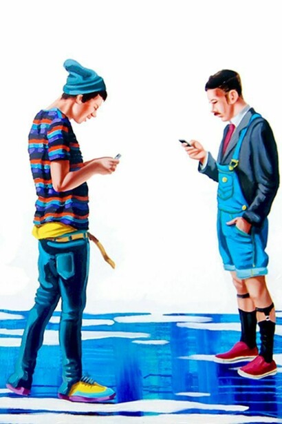 Zeni's Arbeiten stellen keine Architekturmotive dar. Vielmehr sind die Figuren auf einen weißen intergrund positioniert. Der Boden wird durch einen freien, expressiven Farbverlauf ersetzt. Die weiße räumliche Leere hebt die einzelnen Figuren hervor und betont dadurch die Attribute der "Generation Y". Handys, Label aschen, Sneakers oder IPads kennzeichnen die Menschen unserer Zeit.