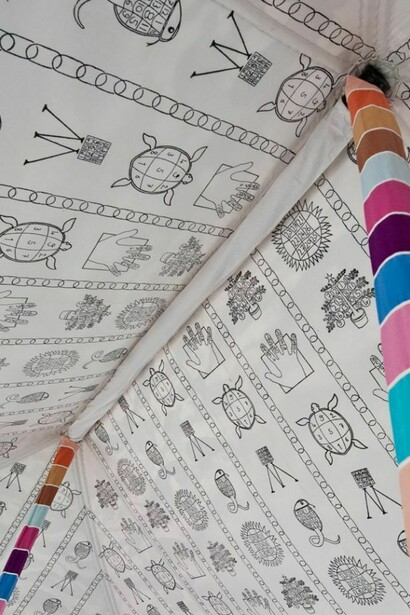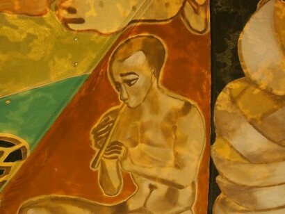 Spielerisch erkundet Clemente Aspekte persönlicher Identität, untergräbt Konventionen. Inmitten einer gemusterten Grisaille aus tierischen, botanischen und numerischen Holzschnitten, sind außen am Zelt Bilder von Fassaden bekannter Museen gemalt, schwebende Ovale in Ocker und Umbra, die aus dem geographischen Kontext gegriffen sind.