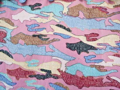 Taking Refuge (2013) konfrontiert uns mit einem dunklen Innenraum, an dessen Wänden eine Vielzahl von blauen und grauen Buddhas gemalt wurden. Sie sind verschieden groß und scheinen ineinander zu verschmelzen: Köpfe verschwinden in Torsi, lassen neue Formen entstehen, die aus einer Masse verbundener Körper blühen. Die Tierköpfe von Katzen und Mäusen etwa, die auf den Buddah-Körpern sitzen, beziehen sich auf die Zyklen von Leben und Tod, Untergang und Wiederkehr. An der Außenseite des Zeltes trifft eine bunt-fragmentierte, camouflageartige Oberfläche auf gestickten Goldlinien, innerhalb derer in großen Lettern das Vajrayana-Gelübde der „Zuflucht“ gedruckt ist.