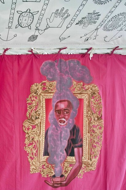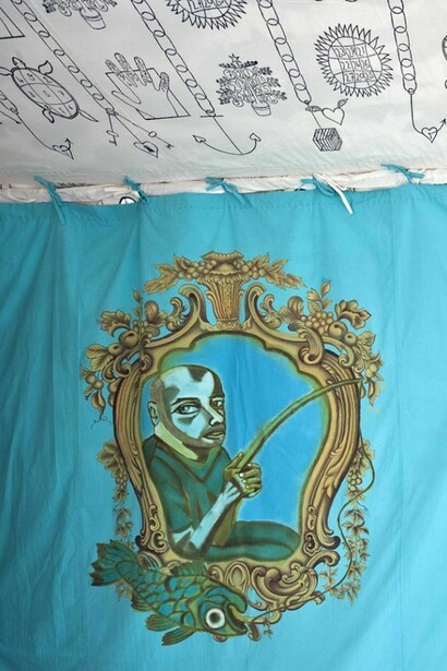 Das Museum Tent (2013) enthält eine Reihe von emblematischen Selbstporträts, die in kunstvolle Rokoko-Rahmen eingefasst sind. Jedes Bild sprengt hier allerdings den Rahmen, bricht mit dem Illusorischen dieser sonst formalen Porträts. Die Arme des Künstlers breiten über den Bildrand hinweg ein Tigerfell aus; eine Angelrute ragt aus der Bildfläche heraus, an ihr baumelt ein Fisch schlaff über dem türkisfarbenen, scheinbaren Abgrund, der Abgrenzung des Zeltes.