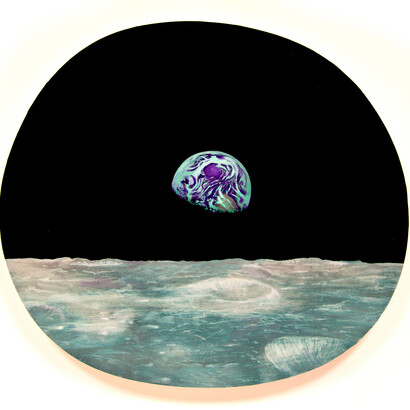 Die Gemäldeserie der Ausstellung stellt eine Welt nach einer genau solchen katastrophalen Folge des Klima-wandels dar, indem sie altbekannte Werke der Kunstgeschichte neuinterpretiert und mit romantischen Naturbewusstsein versieht. Die Romantik, die vor allem eine Reaktion auf die industrielle Revolution war, ist geprägt von einer Sehnsucht nach unberührter Natur und der Ehrfurcht ihrer überwältigenden Kraft. Ironischerweise wird der andauernde und ständig wach-sende Industrialismus voraussichtlich jedoch eine komplett neue Version der Natur schaffen, die die menschliche Welt, wie wir sie kennen, in Zukunft vollständig auslöschen wird. Inspiriert durch dieses Konzept, habe ich Gemälde ausfindig gemacht, die mit der romantischen Bewegung in Verbindung stehen und alle Figuren aus ihnen entfernt – einziger Beweis für eine einst vergangene Existenz sind nur noch die verbliebenen unheimlich grün-violetten Landschaften und die verfallenen Ruinen in ihr. So verweise ich auch auf Fotos von den Apollo-Mond-Missionen, die für den Beginn des modernen Umweltbewusstseins stehen sollen.
