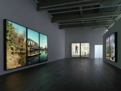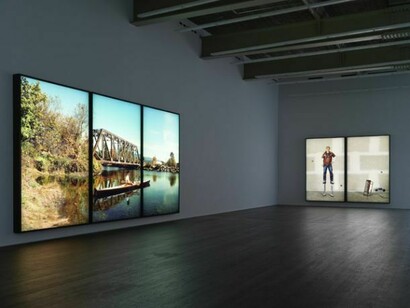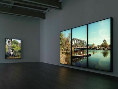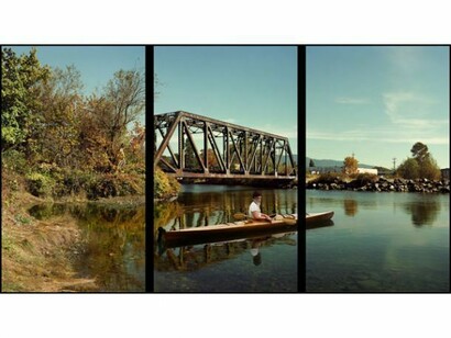 - 2. Rodney Graham, Paddler, Mouth of the Seymour, 2012 – 2013, Painted aluminium lightboxes with transmounted chromogenic transparencies; triptych, 304 x 546 x 18 cm / 119 5/8 x 215 x 7 1/8 in, © Rodney Graham, Courtesy the artist and Hauser & Wirth