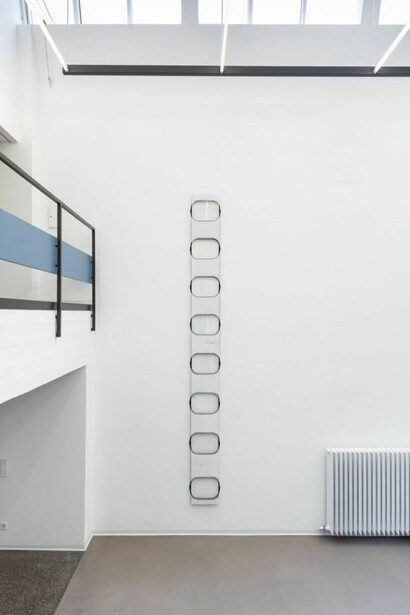 Michail Pirgelis, L'esprit d'escalier, 2013, Aluminium, Titan, Lack, Acrylglas, Gummi, 415 x 41 x 5 cm, Installation view, Akademie der Bildenden Künste, Berlin, 2013, Copyright Michail Pirgelis, Courtesy Sprüth Magers Berlin London