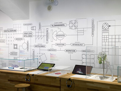 Zu sehen sind zeitgenössische Projekte von Designer-innen, Architekt-innen, Programmierer-innen und Aktivist-innen, die Herausforderungen der Gegenwart aufzeigen, Alternativen vorstellen und zu neuen Lösungen inspirieren. Dazu gehören Projekte wie eine Mehlwurmfarm für die Zukunft der Lebensmittelindustrie, ein 3D-gedrucktes Lastenfahrrad, das im Sinne des Kreislauf-Designs produziert wurde, Arbeiten zu Aktivismus und Gegenstrategien zur digitalen Überwachung, aber auch Highlights der Designgeschichte wie die Frankfurter Küche von Margarete Schütte-Lihotzky, die ein Teil der Präsentation über Care-Arbeit ist.