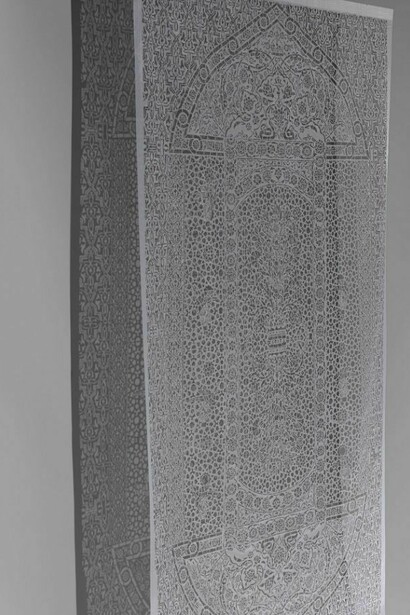 Afruz Amighi (b. 1974) was raised in New York by Zoroastrian and Jewish parents. Her work is infused with global awareness and a distanced view of her native country’s turmoil. Vegetal and geometric patterns bridge contemporary sensibilities and artistic references from Iran, Ottoman Turkey, and Andalusia. Still Garden is created by the projection of light through a hand-cut stencil sheet of woven polyethylene (the material used to construct refugee tents).