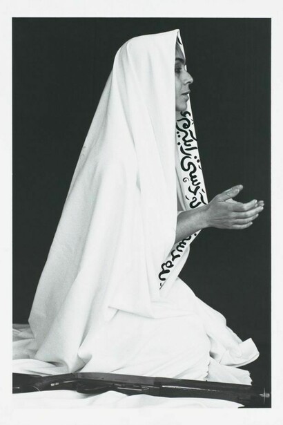 The veiled, gun-bearing women and the black-and-white photograph format of Shirin Neshat’s (b. 1957) work suggest newspaper clippings that show Iranian women’s involvement in the Iran-Iraq War and the Islamic Revolution. In Way in Way Out from the Women of Allah series, the woman’s hand gesture suggests prayer, and the popular prayer inscribed on the edge of her white veil reads: “I give a hand so I can be held.”