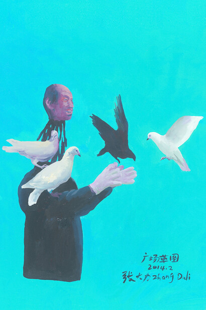 Square - Sketch is a group of paintings that were initially created solely as an outline for Zhang Dali to explore his desire to create the aforementioned body of sculptures. At the top of a sky-blue background, there are images of doves and disconnected human heads which reveal a blunt expression of the pain and simultaneous hope that underpin Zhang Dali's thoughts of Tiananmen Square. The complex and unexpected relationship shared between these ideas—decapitated heads, jovial movements of bodies, sky blue backgrounds, and doves—elevates these paintings past their initial existence as sketches and towards the refined form of expression found throughout Zhang Dali’s work.