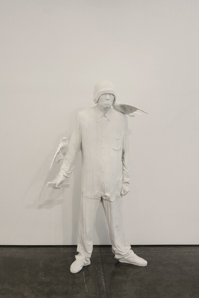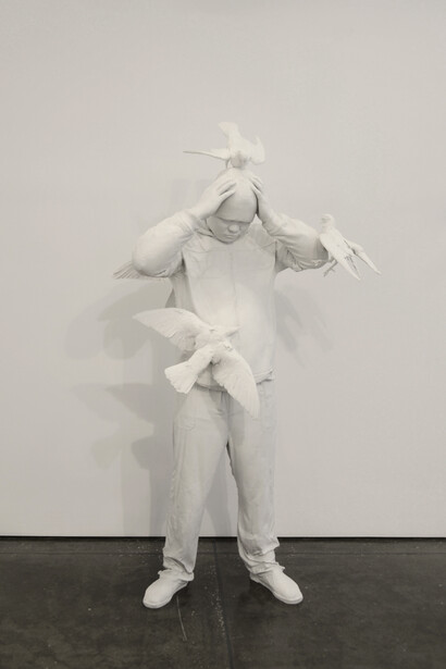 The sculptures in the series are pristine white fiberglass casts of migrant Chinese workers in their everyday clothing. Attached, above and amongst these free-standing casts, are flying and resting doves also cast in white fiberglass. The scene that the sculptures craft could be plucked directly out of Tiananmen Square, with one major exception—doves are nowhere to be found in this city center. These scenes are imagined and Zhang Dali can only dream of seeing doves in Tiananmen. The free-flying birds represent the artist’s resolve to reconstruct what Tiananmen symbolizes—wishing it was a place where thoughts, desires for the future, and an individual’s resolve are free to soar.