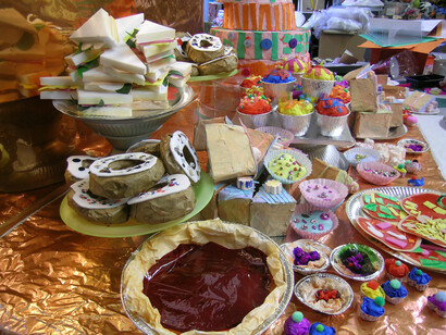 The Wilfred’s Party installation includes a table groaning with party food made by children at Rushmore Primary School, Hackney, and St John’s Primary School, Tower Hamlets, in artist-led sessions. The party guests have been created by invited artists based on interpretations of their favourite characters in the Museum’s collections. Becky Bauer, Teresa Hare Duke, Jasleen Kaur, Oat Montien, Katherine Tulloh, Ruth Weinberg, Cathy Wren and others have contributed to the scene. Children, parents and carers from Rushmore Primary School, Hackney and St John’s Primary School, Tower Hamlets, and adults from Tower Hamlets College have all contributed their ideas to the display.