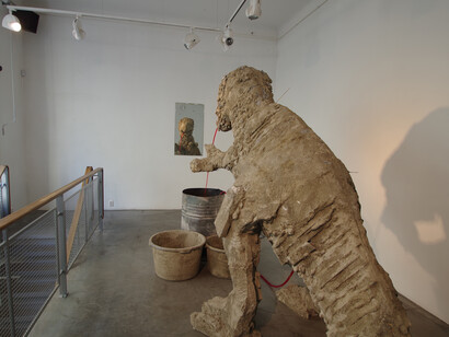 A fourth instalment of this series of exhibitions, it displays the artist’s unwillingness to give up the theme of “drama” that she has been studying for the past three years. There was the first, Berlin drama: an installation that marked the artist’s departure from her early more joyful exhibitions, often featuring sculptures of animals. The only hint that remained from these early post-university shows was a sculpture of a black dog observing a much darker installation: an industrial construction supporting a dismantled human, her organs externalised, flows of blood and brain exposed in a cynical representation of a biological construction of a drama.