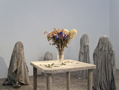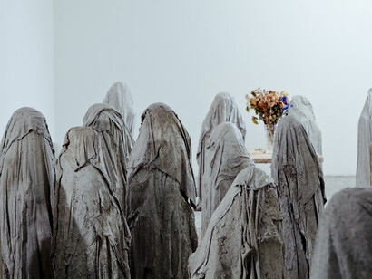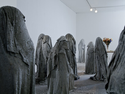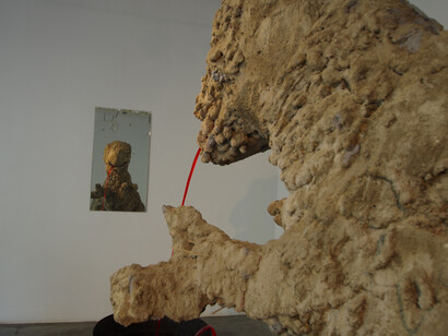 The second exhibition presented an army of child-sized ghosts poured out of plaster, marking a point in Karlson’s life post-thirtieth birthday when childhood fears met anxieties of adulthood. The third was a more expansive installation, deliberately showing a less defined moment, perhaps, opening a path towards less predetermined dramas or surrendering to what was to come next. There were several works on view in a significantly less united arrangement. A dinasour examining itself in a mirror with a streem of blood coming out of its mouth; basement floor covered in plaster; ceramic geese with their necks bent; and next to these a lonely ghost sculpute from Karlson’s previous show, only this time with a smiley spraypained onto its previously blank face. Accompanying the last show was a press text written by the artist herself and comprised of one sentence: "And then they said: „Think positive!“”