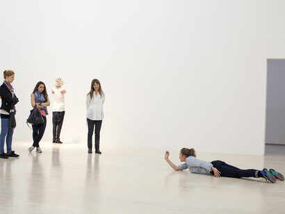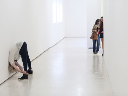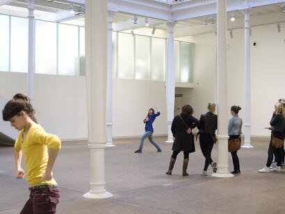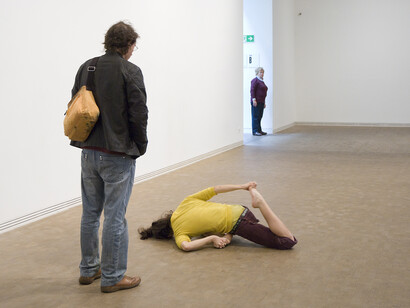 The complex choreographic system underlying the exhibition reveals itself gradually. Upon entry, visitors are often astonished at being directly addressed by strangers in an otherwise empty gallery. They are then free to wander, deciding how much time and attention they would like to give the works on display. Through the exhibition the visitor is presented with multiple conceptions of time: the period during which Le Roy conceived the referenced solo works (1994-2010), the duration of the individual gallery visits, the performers’ daily labor time, and lastly the transformation and development the exhibition undergoes over the course of its two month run. It is within these complex temporalities that the work offers its greatest potential. Instead of fostering the sensation of pure presentness, valued by so much of performance art today, Retrospective creates situations that allow viewers to consider how we use, consume, and produce different modalities of time.