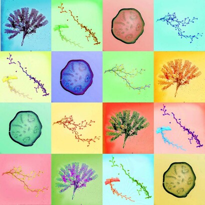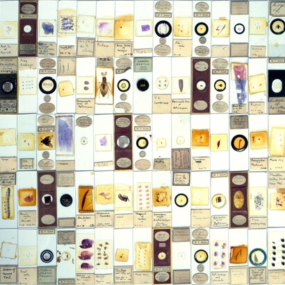 Mary has found her mother's original laboratory slides from the 1930s a rich source of inspiration and for this exhibition she has re-interpreted them and re-presented them in a variety of ways - using both old and new technology. From cyanotypes (a very early form of photography) to reprinting the slides of insect larva onto huge pieces of tracing paper, to manipulating the images in Photoshop to produce a homage to Andy Warhol, to decorating ceramic tiles with the slide images, Mary has breathed new life into these tiny, old objects, which have a strange beauty of their own.