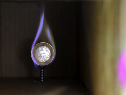 Nearby, on top of two bases, the work Moeda Fria: R$ 1,00 (Cold Currency: R$ 1.00) and Nota Fria: R$ 100,00 (Cold Note: R $ 100,00) (2014) employ yet another synaesthesia to make money burn infinite and aseptically. The big and small money appear equally harmed by the flames as if they were still burning. Now, is our ability to interpret information in different planes as one (something as practiced while watching cartoons' traditional technique) that consumes the illusion of the never-ending fire to consume its substrate. This is the same ability to deceive that lend to the next work, Corda Gota (Rope Drop) (2013), led to believe that there is water where there is not, that something is actually happening before us.
