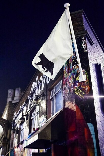 Other touches added to the gallery include a custom made flag flying outside emblazoned with a bear’s silhouette and a reception desk made from wood reclaimed from a local demolition site.
