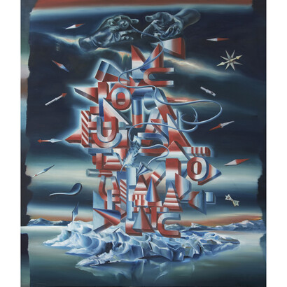 Ye Nan’s new oil paintings in Project 1984, Thirty Years Later represent a major new development in his work. He has not abandoned his predilection for establishing relationships between objects of widely differing significance but for the first time he uses the medium of oil painting to unify them in ambiguous spatial settings. He refers to these irrational conglomerations of forms, both organic and geometrical, as “monuments relating to monuments” and “monuments that do not commemorate persons or events that exist in reality.”