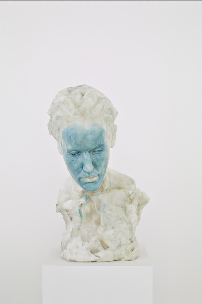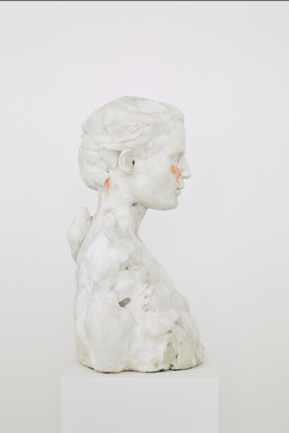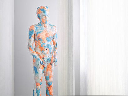 Intensely informed by the outside perspective on cultural definition, Ittah’s core practice is rooted in the repeated appropriation and manipulated idolization of Greco-Roman sculpture, from the Neoclassical period to today. Her primary focus is the problematic definition of white marble as a symbol of purity indoctrinated by the ideals of Western art history. Thus, creating works that have a sense of permanence and weight to them, such as the standing figure, is tantamount to confronting these issues. Yoda approaches this issue from a more abstracted and fluid angle, focusing instead on creating sculptural works in which motion is a defining property. The suspended mobile is a perfect example of his interest in creating quietly reactive objects. Composed of two large cylindrical cones made of a fleshy coloured silicone, the objects are hung at unequal levels by a single piece of rope. This kinetic sculpture moves freely with air movement or with direct contact, a marker of the artist’s struggle to feel anchored. As with Ittah’s sculptures, Yoda’s work has the intriguing contrast between the natural material of the silicone and the mechanical quality of the rope and system of suspension. This unequal balance-scale reads as a self-portrait of the artist, a symbol of his fractured identity that evolves and changes with varying social and cultural influences.