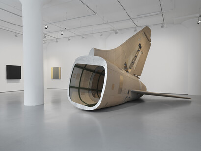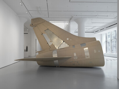 Also on the ground floor will be Haraguchi’s celebrated sculpture A-7 E Corsair II, 2011, the fifth in a series of full-scale replicas of jet tails of Vietnam-era American warplanes that the artist has created since 1968. Handcrafted from wood, aluminum, and canvas, and finished in graphite pencil, the lightness and delicacy of the materials belie their charged, political form.