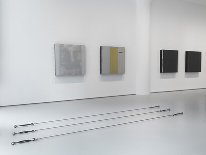 Downstairs, the gallery’s concrete floor has been drilled to accommodate Haraguchi’s Wire Rope sculptures, the first of which was executed in 1970. Thick, horizontal lines of steel rope are bolted to the floor and stretched almost to the breaking point. Visually light but loaded with potential destructive energy, the Wire Rope sculptures occupy a zone distinct from Haraguchi’s peers, such as Fred Sandback and Chris Burden.