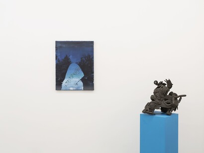 Jonny Green performs a similar ruse: first composing small maquettes, the artist then painstakingly repaints these still-lives (or are they figurative paintings) with oil on canvas. The resulting hyper-real paintings depict crudely rendered Play-Doh monsters, decked out in dollar-store Christmas lights, paper flowers and decommissioned clock parts. But what is hyper-real when the subject itself is not ‘real’? Here we believe the artist as omniscient. But we are reminded that we are viewing a carefully recreated scene, a painter's scarecrow, meant to trick us into believing the silliness and its veracity like a type of representational mise-en-abyme. True, they are hyperreal, but to what extent, if the very imagery they depict is itself so detached from reality? Jose Carlos Naranjo Bernal, the only other representational painter here, finds a breakdown of reality through mark-making, where subject matter seems incidental, almost as an afterthought to their framing within the painted plane: where elements of urbanity (a chainlike fence, for instance) becomes a purely aesthetic pattern. Where a blue-black silhouette leads us to read such a mark as a figurative painting?