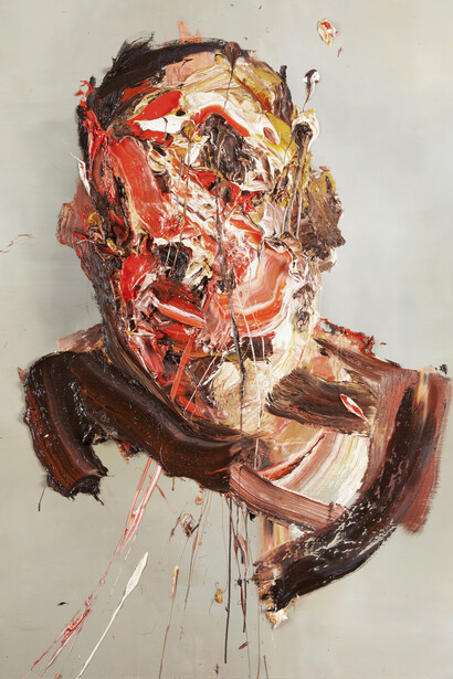 The paradoxical notion that the self can be uncovered through the most narcissistic of gestures is explored through his relationship with the paint. The self-analytical dialogue is enacted through mark-making, the artist’s hands and brush carefully constructing layer by layer in a vicious attack of the canvas. Set against Rembrandt-like backdrops of pastel and colourfully marbled hues, thick brushstrokes overlap, bleed and fuse into one another constituting a unique and authentic persona. This painterly snapshot of ego is laid bare for his audience to question and dissect purely through the multiple layers and heavy concentration of his medium. “I’m trying to create a sensual body that emanates a soul or some kind of embodiment of human emotion. I want to say it all with the actual medium this time without illustrating it. I wanted the luscious density of the paint itself to describe the feeling without narrating it.”