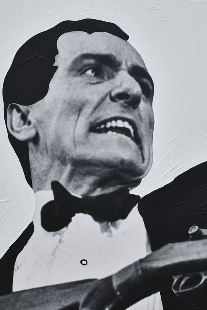 The film images in Pictures & Scripts are cropped to heighten their ambiguity, deliberately isolating iconic film roles like cowboys, gangsters and ingénues, displaced from their original dramatic context and animated with new narratives for the viewer to construct. Each painting is a diptych composed of an image and text element, the text half of each painting similarly presents a glimpse of a larger dialogue, seemingly lifted from its original context. Language and image are presented on equal ground without hierarchy, so that the essence of the work is in the intersection of the two. The arrangement of words and images has been a defining interest of Baldessari’s since the 1960s when he stated “a word could be an image or an image could be a word, they could be interchangeable’’.