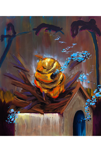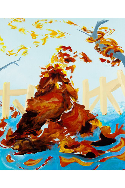 Surreal landscapes contain swirls of movement and colour. Exotic, tropical islands and staid, backyard hammocks are drawn together by gestural brushstrokes. They are either saturated with bleached light, or imbued with the deep purples of encroaching winter twilight. The dissonance between fiction and reality, the familiar and the unknown, are all swirled together in a sense of giddy lightness – autumn leaves are swept up in gusts of wind, curling around tree trunks before dispersing into the crisp air. Elsewhere, a beehive comes crashing down, its weight sending the roof of a shed into splinters; blue flecks rise from both hive and shed as though a gust of breath or some strange spirit had been expelled. Regular, everyday sights, such as tire swings and piles of raked leaves are in the process of either falling apart or being swept away, a reminder of the fragile nature of reality.