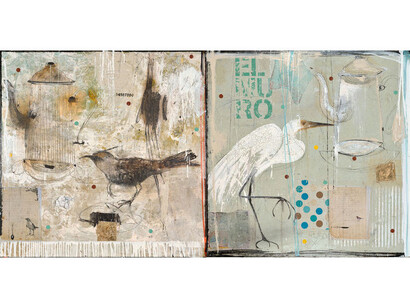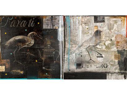 His artwork is a visual delight of textures achieved by juxtaposing layers of oil, sgraffito, enamel pats, volumes of paper and screen printing on canvas.
