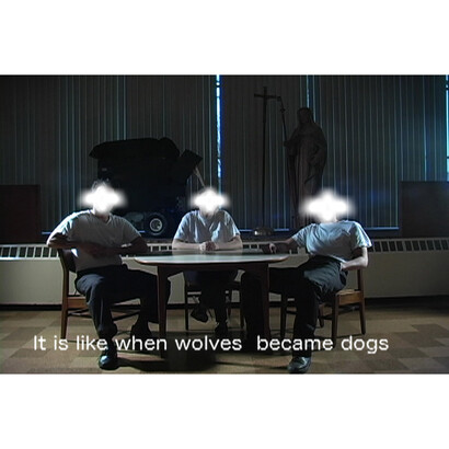 “Neither synopsis nor ekphrasis are possible in the case of The Bible,“ continues Bedford. “One could agonize for hours over a description of a 10-second passage and still come up with only the most woefully inadequate explanation; to characterize Hartung’s aspirations as interpretive in any conventional sense is a stretch. One could say, however, that the video’s often-oblique relationship to its purported origin text becomes apparent in various, sly senses: through analogy, anecdote, allegory, and even abstraction. The leap of imagination (or faith) required to discern these points of connection may be considerable, but the surprising consequence is a vivid world in which an ancient text is made to live with us in the social and political present, often very uncomfortably. If, as we hear in the video’s opening minutes, ‘ordinary thought is not very subtle; it’s very coarse and a lot of things slip right through,’ The Bible is Tommy Hartung’s wild and unruly call for a much finer net, and it is very persuasive.”