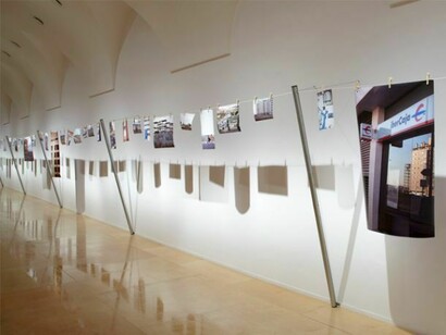 In 2010 Haacke found in Madrid’s Ensanche de Vallecas suburb a site that encapsulates such fears. Frozen in time, a large urban development, dominated by skeletons of buildings whose construction was abandoned when the housing bubble burst, looms as the surplus of arrested development. The almost deserted streets bear the names of 20th century artists and art movements. A failed economic and urban model is associated with a nomenclature stripped of all discursive potential and converted into a registered and monumentalized trademark. In contrast to the absence of life in the buildings, their plans, used as a guide for potential buyers, together with the property registration files and the waving movement of nylon threads, seem to reanimate the invisible market trickster, and they expose the vulnerability of artistic and economic projects that have turned into fantasies and castles swayed by oscillations as imperceptible as they are decisive.