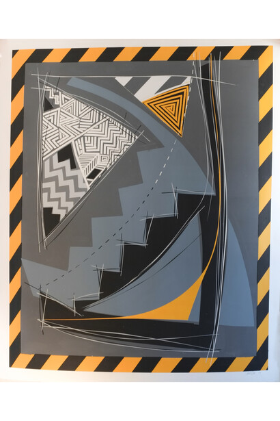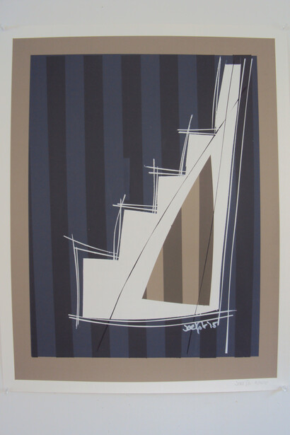 I subscribe to the theory that less is more and to that end apply a few self-imposed restrictions on my work. My palette is limited by whatever comes my way plus black and white. I limit my images and work in series. I usually focus on a single repetitive image (in this case stairs) for the length of the entire series. The side view of stairs was an early memory that I drew as a child. The stairs may be a metaphor for the challenges of navigating through the world.