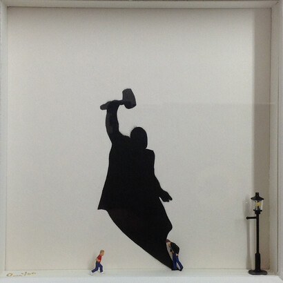 We are Heroes features some of the best known superheroes, Superman, Batman, Thor, The Hulk, Spiderman and Catwoman; each figure appears as a shadow behind a miniature figure, signaling the sudden revelation of our inner hero.
