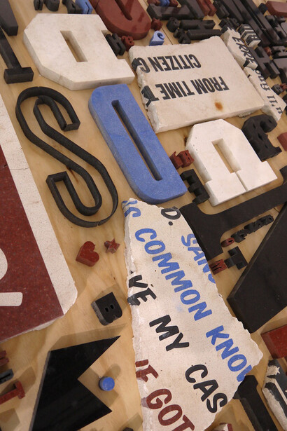 The letters that form the carpet are made of 30mm solid granite, which were then cast into high-quality concrete panels. Using new techniques and materials, Young created a specialist factory and recruited a production team for the manufacture of the letters. From the cutting of these letters in many differing fonts and sizes, the process generated literally tons of wonderful waste granite in a variety of typographic shapes and forms, which now form part of the exhibition ‘Comedy Carpet Off-Cuts’ at Jealous Gallery.