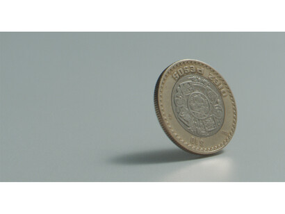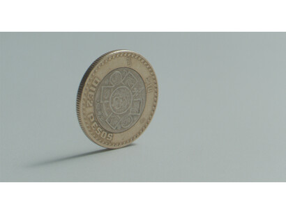The exhibition is powered by energy harnessed using solar panels on the roof of Chisenhale’s building, which feed a set of batteries installed in the gallery. The off-grid system operates as a closed circuit, enabling light from the sun to be transformed into projected light. A second film acts as a sculptural vignette, depicting a Mexican ten-peso coin spinning in slow motion. The coin loses and regains momentum in a continuous loop, as if in a state of thermodynamic equilibrium.