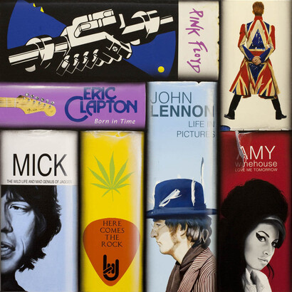 Books are about language; a conversation between character, author and reader, therefore they can both stir the imagination and memories. Beliveau draws cultural references through his carefully curated compositions and juxtapositions. The paintings are grouped simplistically and include themes such as music, history, art movements and artists, and pop culture, all named with classical titles and Latin numbers, they are styled minimalist on clean backgrounds and are made up of graphic interlocking of shapes.