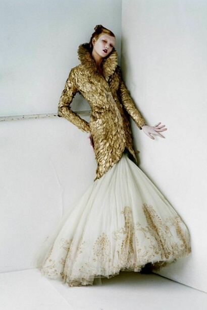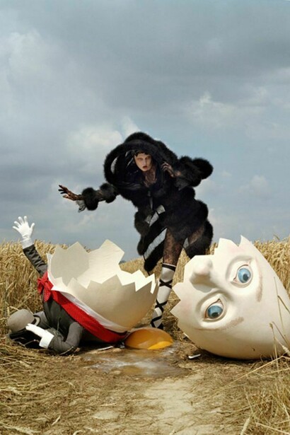 Working with the biggest names in contemporary fashion and culture, in Tim Walker Story Teller you will encounter Alber Elbaz sporting a pair of rabbit ears; Karen Elson up against it with a giant crocodile; Agyness Deyn in the sand dunes of Namibia; Tilda Swinton in Iceland; Alexander McQueen and a memento mori of skull and cigarettes; Helena Bonham Carter and Tim Burton turning an Essex garden centre into a danse macabre; Stella Tennant in a pink cloud among the rhododendrons of an English country garden and a visitor from outer space surprises a foxhunt in Northumberland.