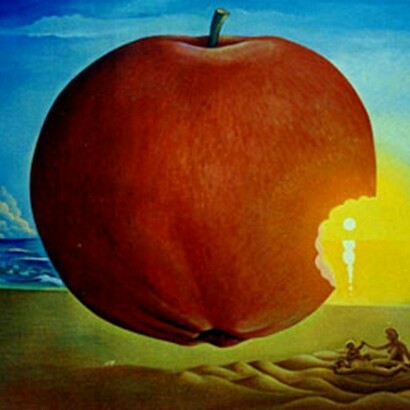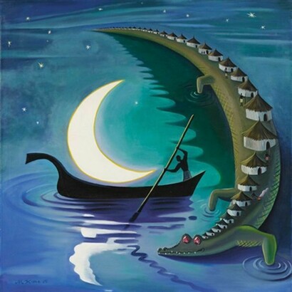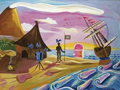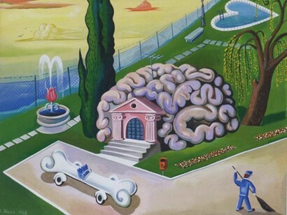 The apparent idyll of Kunc's paintings is interrupted by bizarre and incongruous elements: a tank that becomesa brain, the Fuji mountain smiling, some eyebrows transformed into a dove ...