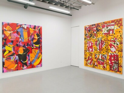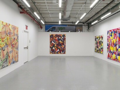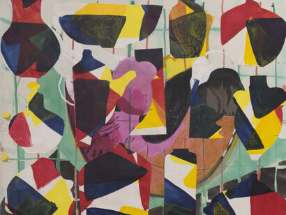 In this latest body of work, Silverstein draws inspiration from the realm of domesticity to guide her gestures. The marks on the layered surfaces are improvisational yet influenced by decorative objects. The shapes and patterns in the work reference physical objects such as ceramic vases or textiles, however the abundance of colours and lines obliterates the boundaries of the figures, releasing the viewer from symbolic references.