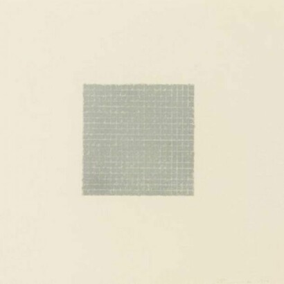 Jo Baer (b.1929), Carmen Herrera (b. 1915), Robert Mangold (b.1937), and Sean Scully (b. 1945) further explore the potency of line and color. In Untitled (1972), Baer expands the stark white center of her composition, pushing thin bands of her distinctive black and blue hues to the very edges, to create a shift in the use of central space, characteristic of her minimal works of the 1970s. Herrera creates striking spatial tension by the precise placement of a thick graphic L-shaped black line that dissects a bold field of saturated green in Untitled (1976). More subtle in color and treatment of line, Mangold’s Four Triangles within a Square (Cream) (1976) conveys a sense of architectural drafting. Scully’s paintings also suggest built space, but through painterly brushstrokes that make up horizontal and vertical bands of subdued colors.