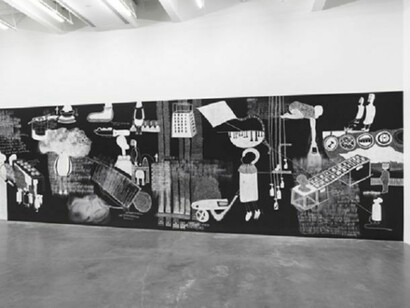 His Polaroid photographs read as quick glimpses into the artist’s archaeological methods: soap suds and a pair of hands outstretched could belong to the guilty Lady Macbeth or Winnie Mandela, accused of conspiracy in the murder of African National Congress activists. Another photograph shows the artist, his face obscured by a newspaper whose headline declares a woman’s failure as a Sangoma—a traditional healer who uses bones as a means of communication with the spiritual world. The fogged frames of these Polaroids emphasize their technical obsolescence, highlighting the aspects of South African past that resist accommodation to the structural tools of the present.