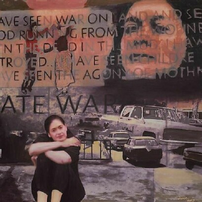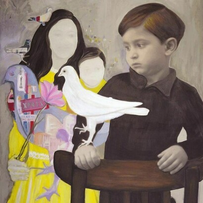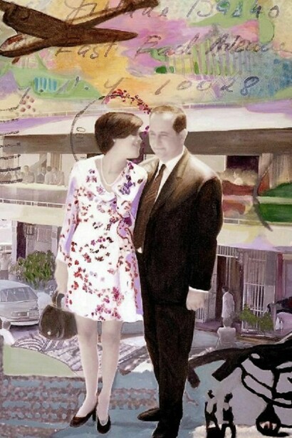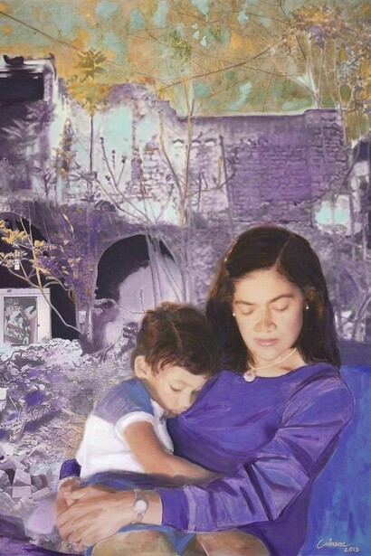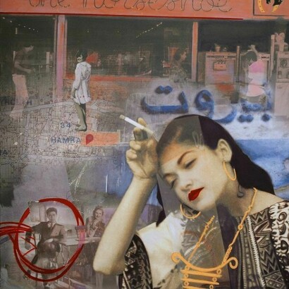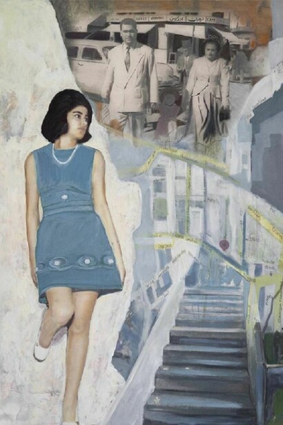 'Afterimage' presents a highly personal series of paintings which Makki Bacho refers to as her ‘memoirs’. Having trained as a writer before attending art school, narrative is central to her artistic practice. Working from personal photos collaged together to create ‘flashes’ of her past that overlap and merge, the paintings allow the viewer glimpses into Makki Bacho’s history set against a wider narrative of the changing face of Lebanon; the viewer shares in her intimate memories, but also the pain of a country torn apart.