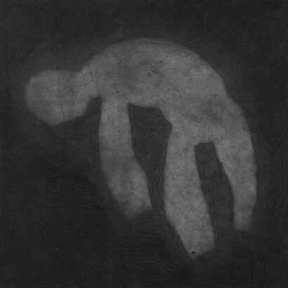 Through the show, a floating, footless figure drifts from painting to painting. He has no name but is a recurring form in the imagination of Alfraji. He is but a shadow; a mass of black, layers of charcoal and Indian ink, stretching like a giant above us. On closer inspection, his skin is cracked and tired. Lines snake through planes of darkness, punctuated only by his detailed hands and eyes, echoes of a concrete world.