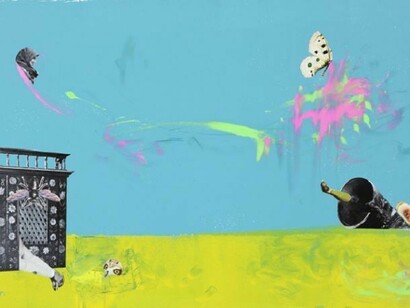 Their collages are like stage sets on which splashes of pigment and found images of animals or humans are assembled in a performance. Playfulness combines with violence as body parts are fragmented across the picture surface. Their figures also metamorphose into plants or birds; macabre yet innocent, they lend a surreal dimension to the Tobias’ imagery. The artists also use the antiquated aesthetic of the typewriter to create intense drawings that spike the eye.