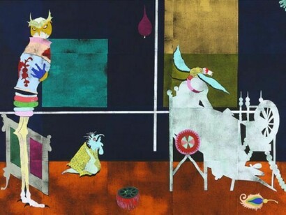 The works of art in this exhibition bring together all these diverse media. Visually, they combine the lines, shapes and block colours of geometric abstraction with narratives reminiscent of Surrealism and patterns drawn from ornamentation and folk art.